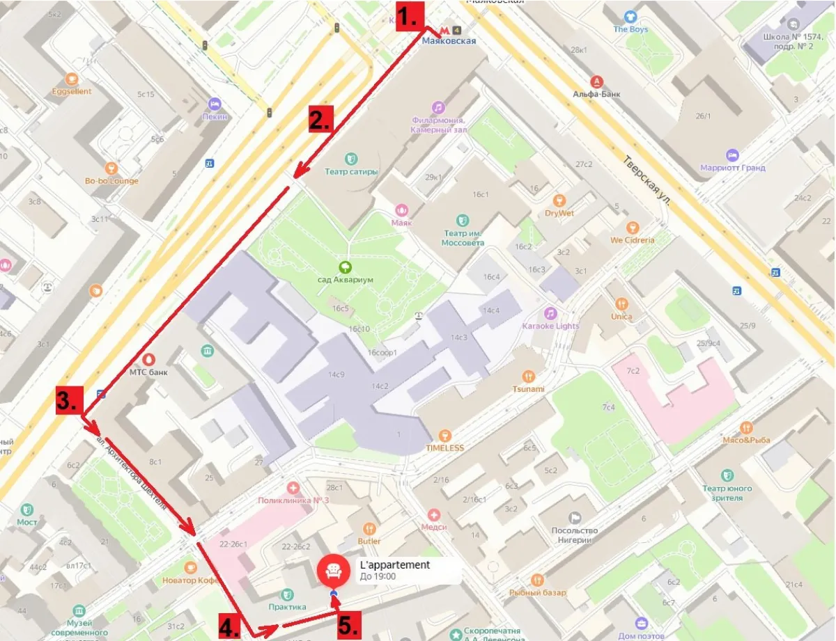 На общественном транспорте: выходите на остановке "Метро Маяковская", идете по аллея Архитектора Шехтеля 230 метров прямо (в сторону Трехпрудного переулка), поворачиваете налево на Трехпрудный переулок, далее слева 5-ти этажное здание, Вы на месте!
