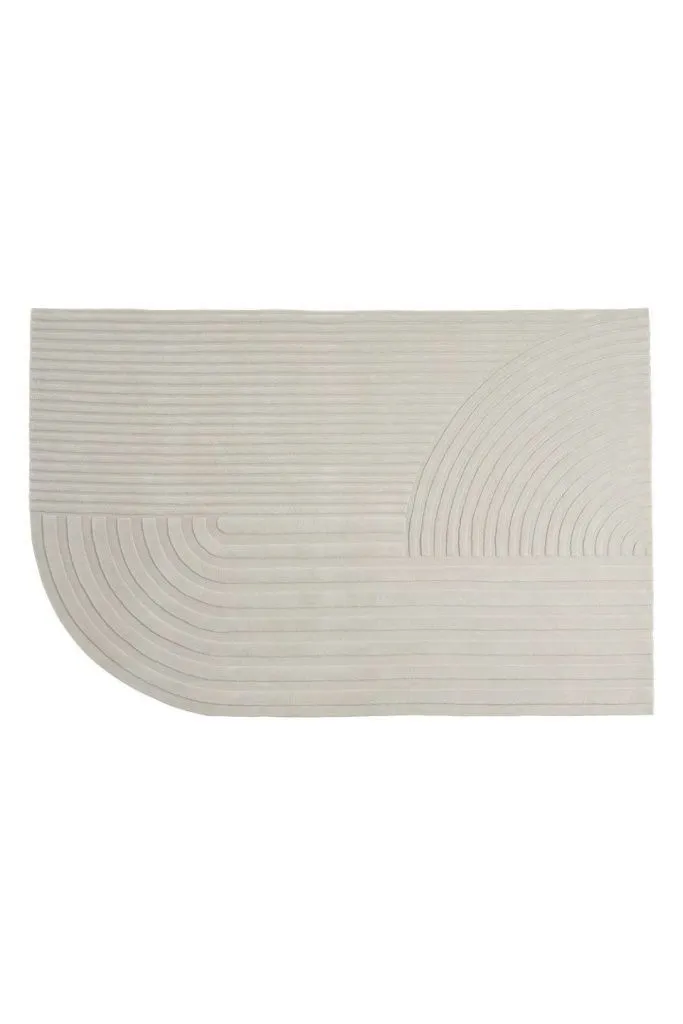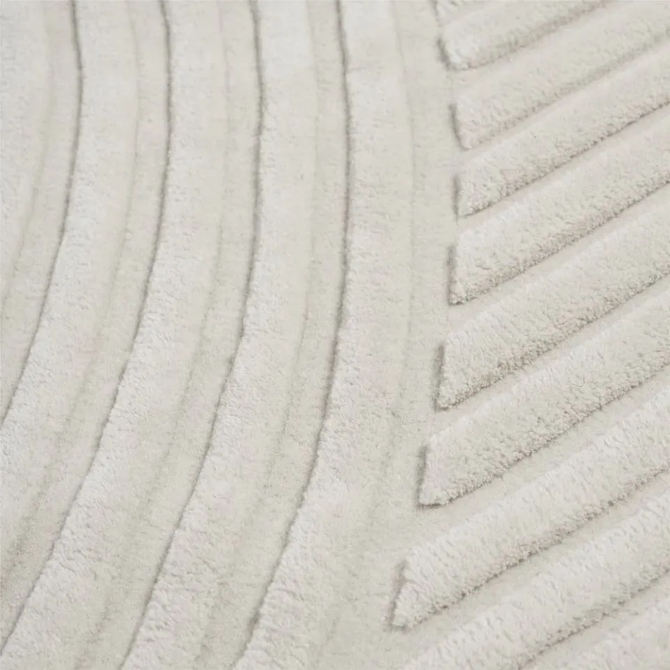 Relevo — это мягкий ковер с ярко-выраженной скульптурностью. Его поразительный графический рисунок создается путем обрезки тафтинговой шерсти на разных уровнях, что создает привлекательную игру теней, придающую ощущение двухцветности, а не монохромности. Единственный закругленный угол ковра добавляет ему уникальный характер.