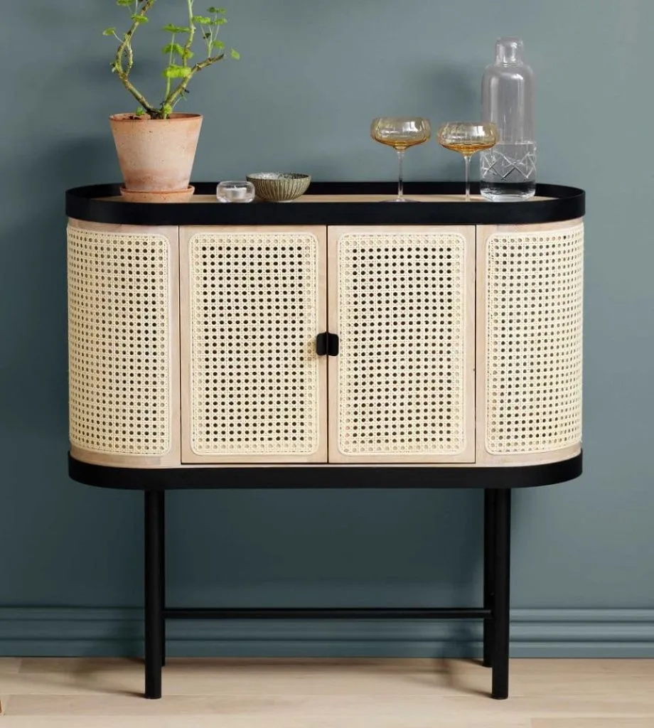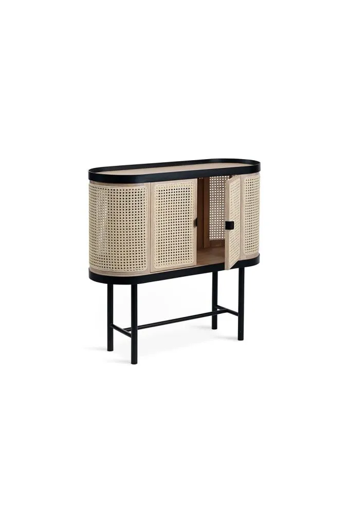 Элегантный барный шкаф из дерева и лозы с простым металлическим каркасом. Изысканный предмет мебели для ценителя, которому нужен стильный барный шкаф, или для любителя дизайна, который мечтает о красивом маленьком шкафчике для гостиной, офиса или спальни.