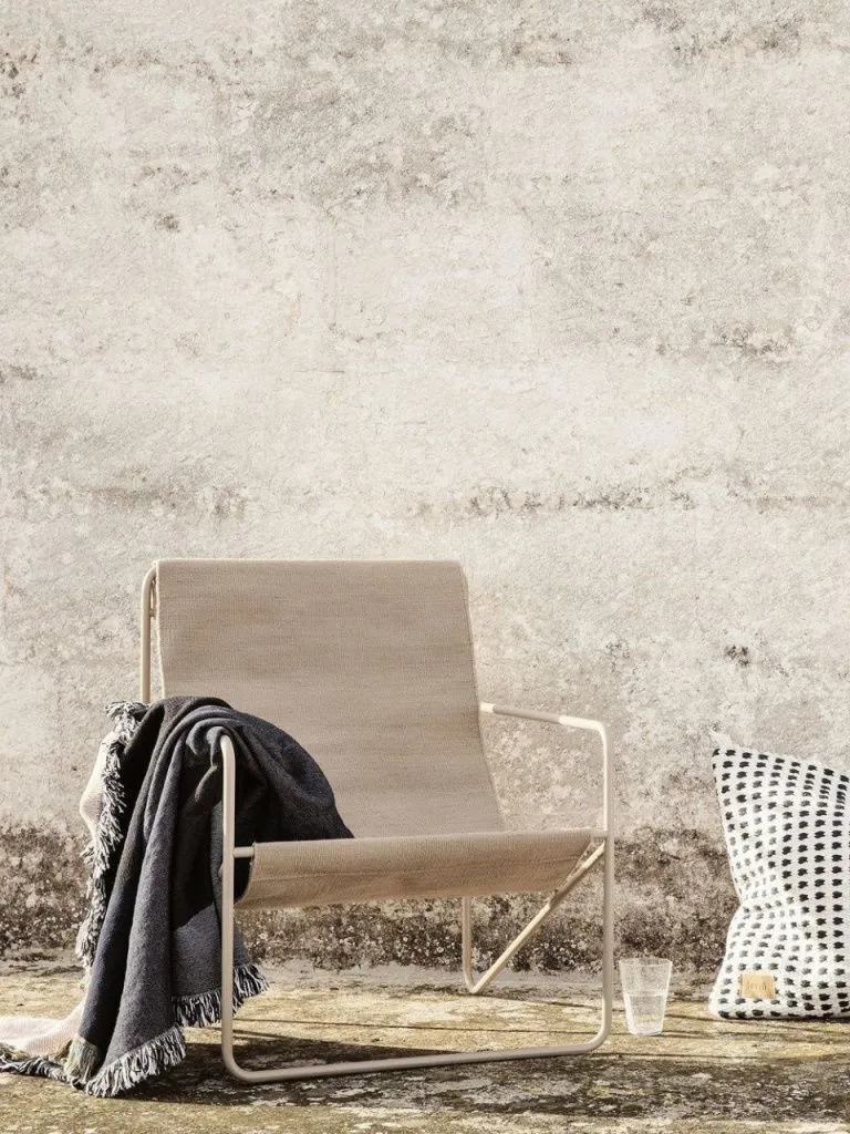 Модернистское кресло с изящным профилем Desert Lounge Chair от FERM LIVING изготовлено из трубчатого стального каркаса с порошковым покрытием. Съемное сиденье сплетено вручную из пряжи ПЭТ из переработанного пластика, что соответствует 53 пластиковым бутылкам. Кресло подходит для использования как в помещении, так и на улице.