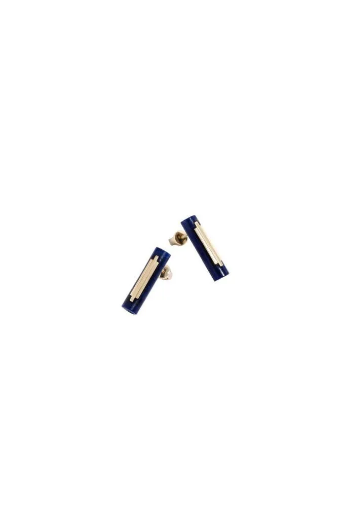 Основа композиции этих серёг – вытянутый содалит глубокого синего цвета. Согласуясь с основными идеями супрематизма, его чистая форма намеренно лишена любых контуров – камень полностью открыт со всех сторон. Три линии из золота соломенного цвета дополняют и уравновешивают композицию.